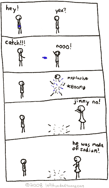 Jimmy(holding balloon): hey! Boy 2: yea? Jimmy: catch!!! Boy 2: nooo! *balloon hits boy 2 and boy 2 explodes* Mother: jimmy no! Mother: he was made of sodium!